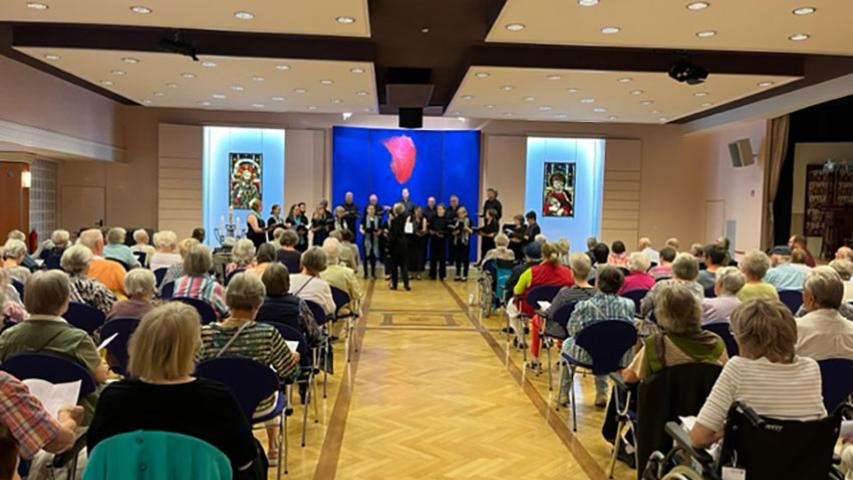 Nach der Stärkung machten wir uns dann also auf zum Konzert. Aus erster Reihe, direkt neben seiner Frau, konnte Dieter gut eine Stunde lang „seinem“ Chor lauschen. Es war Musik, die den meisten Menschen wohl eher unbekannt ist – eine Messe im alt-russischen a cappella gesungen, aber dennoch unheimlich schön. Auch wenn Dieter nicht mit uns sprechen konnte, sah man ihm die Freude an dem Konzert an. Die Sängerinnen und Sänger haben Dieter offensichtlich eine große Freude mit dem Konzert bereitet. Er hat bekannte Stücke wahrgenommen und man hat ihm angesehen, wie traurig er war, als das Konzert vorbei war. Eine Sängerin hat es nach dem Konzert sehr treffend formuliert: „Wenn man jemanden sonst nicht mehr erreicht – die Musik kommt dennoch an.“