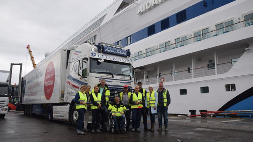 Alle gemeinsam durften wir, mit Sicherheitsschuhen und -westen ausgestattet, in den Sicherheitsbereich auf die Pier gehen. Dort wurde die AIDA Vita, die Reimer schon von vielen Arbeiten kannte, beladen. Alle Kollegen, die Reimer kannte, ob von der AIDA oder der Andreas Schmidt GmbH, kamen vorbei. Die Freude war groß, mit den Kollegen zu reden. Reimer sammelte alle seine Kräfte an diesem Tag zusammen, und wir hatten das Gefühl, dass er einfach dahin gehört. Auch sein Chef nahm sich die Zeit und besuchte unseren Fahrgast.