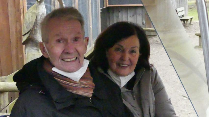Der Empfang in der Familie ist sehr herzlich. Nach einer kurzen Begrüßung geht es auf die nur 18 Kilometer lange Fahrt in den Tierpark Eekholt, wo unser Fahrgast lange Zeit als Tierpfleger tätig war. Während der Fahrt schauen wir besorgt auf den wolkenverhangenen Himmel, aus dem auch ein wenig Regen fällt. Aber kaum auf dem Parkplatz angekommen, klart es auf. Wir dürfen mit dem Wünschewagen direkt vor dem Eingang parken, wo uns Uta schon mit einer Art großem Golfcart erwartet. Sie arbeitet ebenfalls im Tierpark und wird uns den Tag über gebleiten. Nachdem alle Plätze auf die vier Sitzreihen verteilt sind, erwartet uns die erste Überraschung. Auf der Empfangstafel am Eingang des Parks werden Schorsch, unser Fahrgast, und seine Frau Marlies namentlich begrüßt.