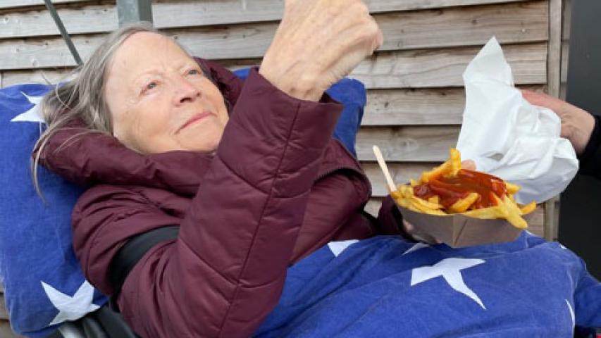 Das kleine Bärchen wurde in der Zwischenzeit „Knopfauge“ getauft, ihm hat sie erzählt, wie gut es ihr geht, wie unglaublich schön dieser Tag für sie ist („Das ist einer der schönsten Tage meines Lebens! Es sind alle so lieb und freundlich!“) und wie sehr sie das alles genießt. Ich stand häufig in ihrer Nähe und habe etwas mitgehört, berührt und beeindruckt von ihr und ihrer Lebensfreude. Tage mit dem Wünschewagen sind Tage, die niemals enden sollen. Weil die Momente so intensiv sind, allen bewusst ist, dass es etwas ganz Besonderes ist und so nicht wiederholt werden kann. Wie soll so ein Tag enden, der schon so wunderbar begonnen hat…? Darauf gibt es vermutlich nur eine Antwort: Mit Pommes! Marco und Vivian verabschieden sich, wir fahren mit dem Wünschewagen an den Weidefelder Strand. Hier gibt es „die weltbesten Pommes“, wenn man Theo, dem Eigentümer glaubt. An diesem Abend waren sie das, ganz besonders, weil es zu der Einladung zu Pommes & Cola auch noch Anerkennung und liebe Worte gab. Ich hoffe, dass alle Menschen, die uns an diesen Tagen durch kleine oder große Gesten unterstützen, und anlächeln oder etwas Nettes sagen wissen, wie sehr wir das wertschätzen. Gerade die gefühlten Kleinigkeiten sind die, die häufig ganz besonders in Erinnerung bleiben.