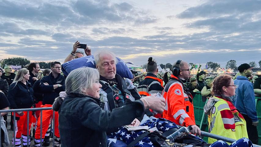 Am späten Freitagnachmittag trafen Nina und ich nun wirklich mit dem Wünschewagen bei Michael ein. Tränen der Begeisterung und Rührung flossen, so groß war die Freude, dass es jetzt doch wirklich losgehen sollte. Das beste Maiden Shirt wurde angezogen, darüber die Kutte mit den vielen Patches und Bändchen der vergangenen Wacken-Besuche. Gemütlich auf der Trage gebettet, und dann ging es los Richtung Holy Ground.
