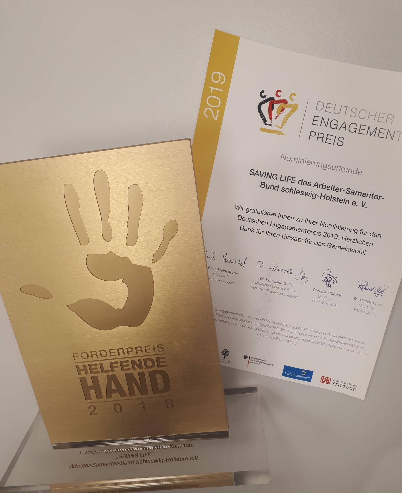 Deutschlands wichtigste Auszeichnung zur Würdigung ehrenamtlichen Engagements im Bevölkerungsschutz wurde 2018 vom Bundesministerium des Innern in der Kategorie "Innovative Konzepte" an SAVING LIFE vergeben. 2019 folgte die Nominierung für den Deutschen Engagementpreis.